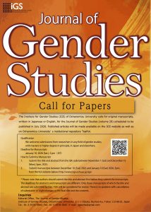 The Institute for Gender Studies (IGS) of Ochanomizu University calls for original manuscripts, written in Japanese or English, for the Journal of Gender Studies (volume 29) scheduled to be published in July 2026. Published articles will be made available on the IGS website as well as on Ochanomizu University’s institutional repository TeaPot.
