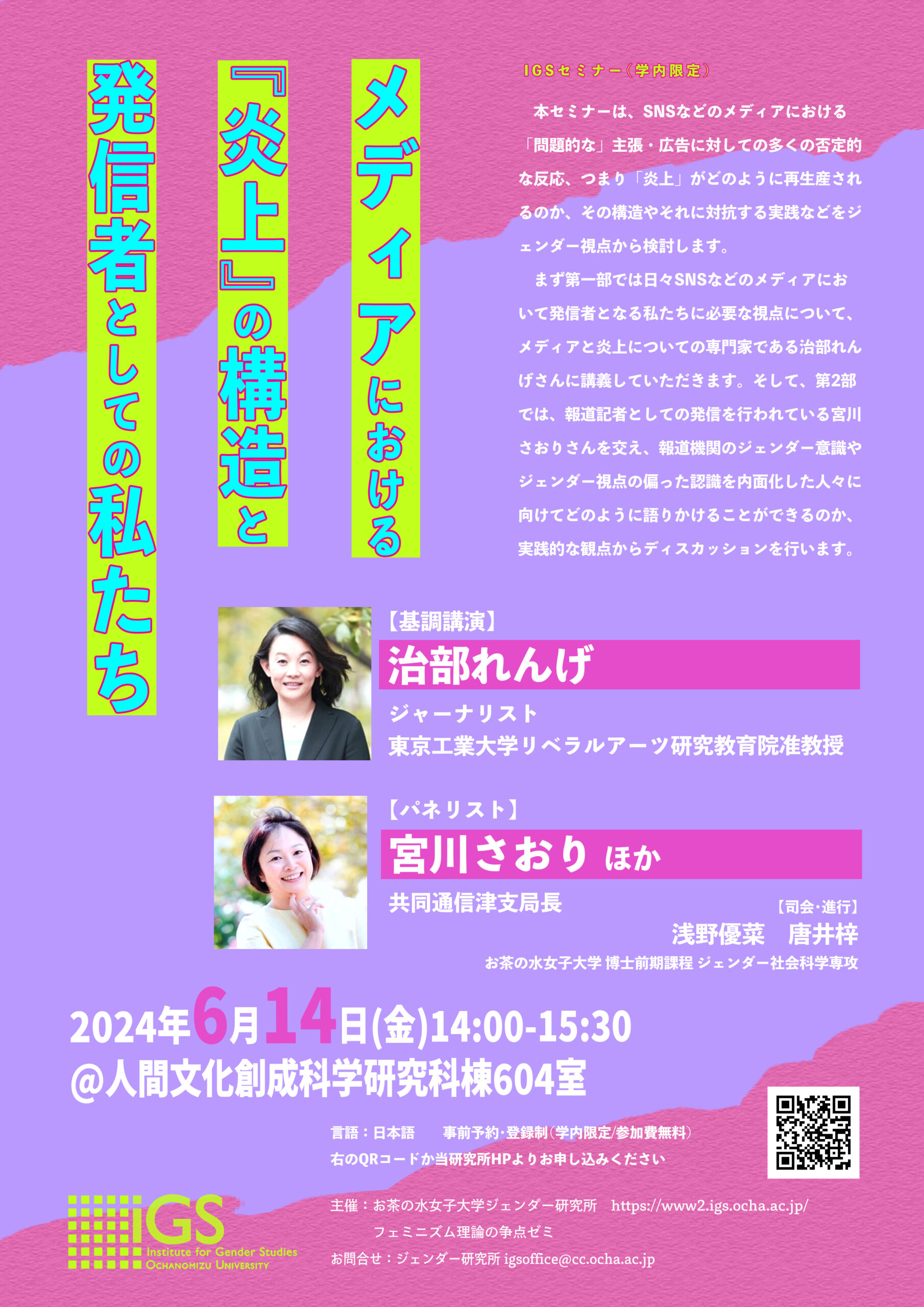 申し込み:メールでお申し込みください。件名:「7/31セミナー参加申し込み」、メール本文にお名前、ご所属を明記して、igsoffice@cc.ocha.ac.jp 宛にお送りください。