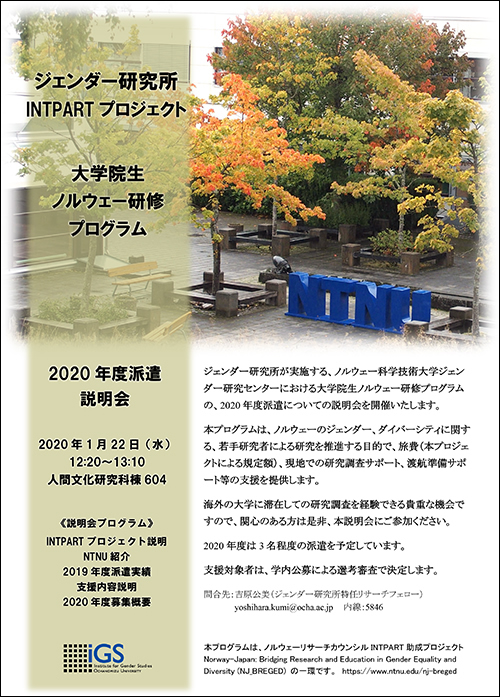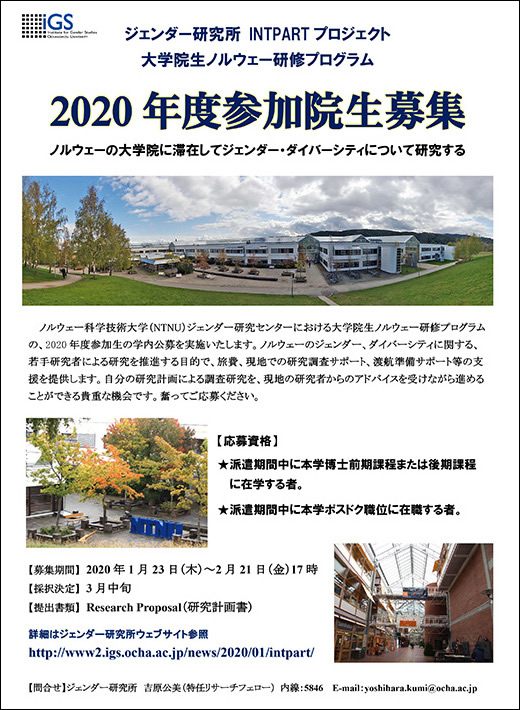 ジェンダー研究所とノルウェー科学技術大学(NTNU)ジェンダー研究センターの共同事業、INTPARTプロジェクト(ノルウェーリサーチカウンシル助成:2019~2021年度)の一環として、大学院生ノルウェー研修プログラムを実施いたします。2020年度派遣生の学内公募要領は以下のとおりです。海外の大学に滞在しての研究調査を経験できる貴重な機会ですので、奮ってご応募ください。