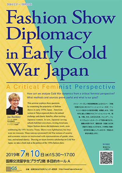 2019年7月10日、ジャン・バーズレイIGS特別招聘教授によるIGSセミナー「Fashion Show Diplomacy in Early Cold War Japan: A Critical Feminist Perspective(冷戦初期の日本におけるファッションショー外交:フェミニスト視点からの批判的考察)」が開催された。講義は、バーズレイ氏が進めている、1950年代日本のファッション文化と冷戦という国際政治の関連性を分析する研究の、方法論を中心とする内容であった。